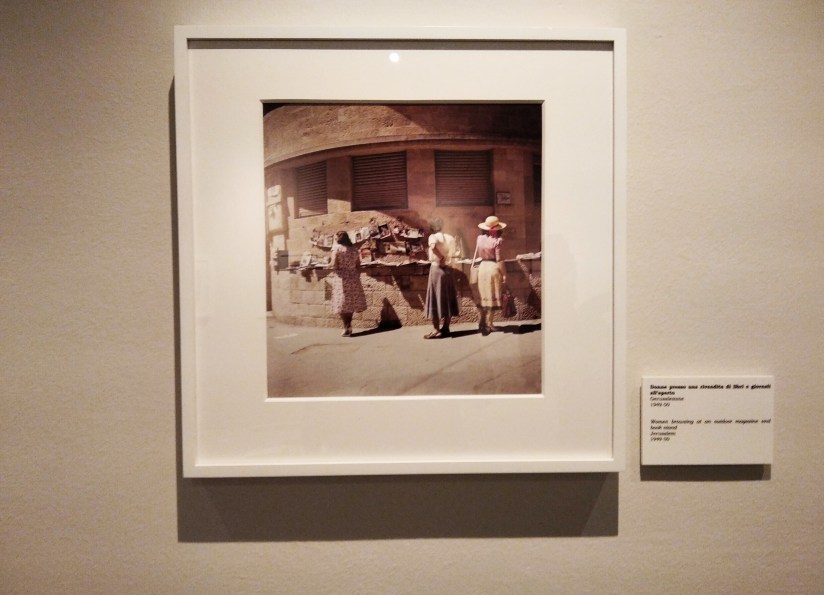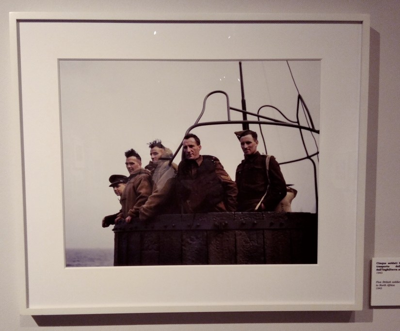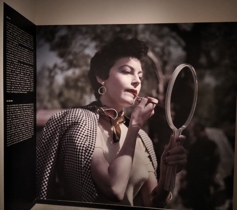 Le sale del palazzo sono un museo, egregia dimora per le immagini ferme, illuminate e affisse alle pareti. Eppure quelle stesse immagini viaggiano dentro spazi poco ampi che si snodano labirintici l’uno dopo l’altro. Pannelli neri, alti e rettangolari scritti con un carattere bianco, raccontano la vita breve e intensa dell’artista. I suoi viaggi. Narra con l’arte della fotografia la vita delle persone, le tragedie della guerra, la grande ingiusta fatica dei soldati, ma anche la bellezza femminile, la moda, il cinema, il coraggio e le passioni di una umanità raccolta nello stesso enigmatico mondo.
