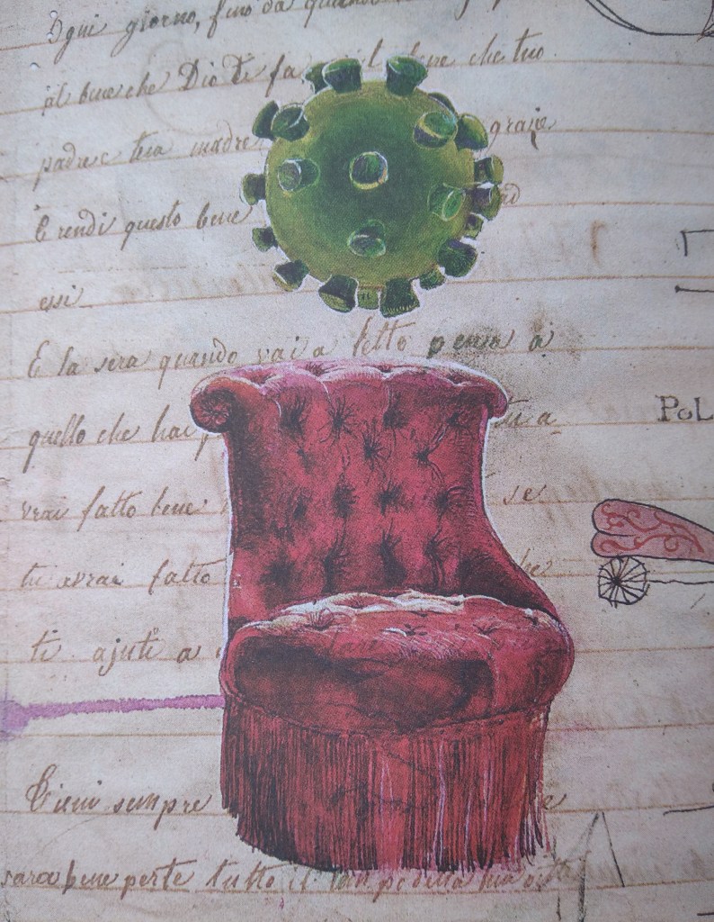 (dalle istruzioni per l’uso dell’autore Stefano Faravelli) ‘‘Il libretto che avete nelle mani, come un fungo è nato in tempi brevissimi: a parte le tavole prima e tredicesima – una sedia senza sedente e un sedente senza sedia – che hanno preceduto l’avvento della pandemia, le altre, e i testi che le accompagnano, si sono tumultuosamente generate tra l’8 marzo e il 10 aprile. Ossia il giorno in cui l’intero paese è entrato in lockdown (l’anglicismo è insopportabile), e il giorno del mio compleanno. La genesi di un’immagine ha sempre avuto per me il carattere di una fermentazione…”