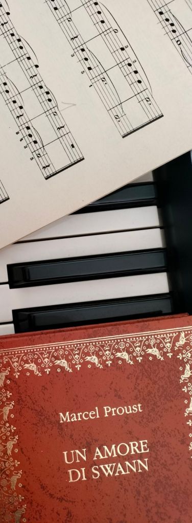 Ed era stato già un gran piacere quando sotto la piccola linea del violino, esile, resistente, densa e conduttrice, aveva visto d’un tratto tentare di sollevarsi in uno sciabordìo liquido la massa della parte del pianoforte, multiforme, indivisa, piana e internamente contrastata, come l’agitazione violacea dei flutti incantanti e flautati dal lume di luna.
