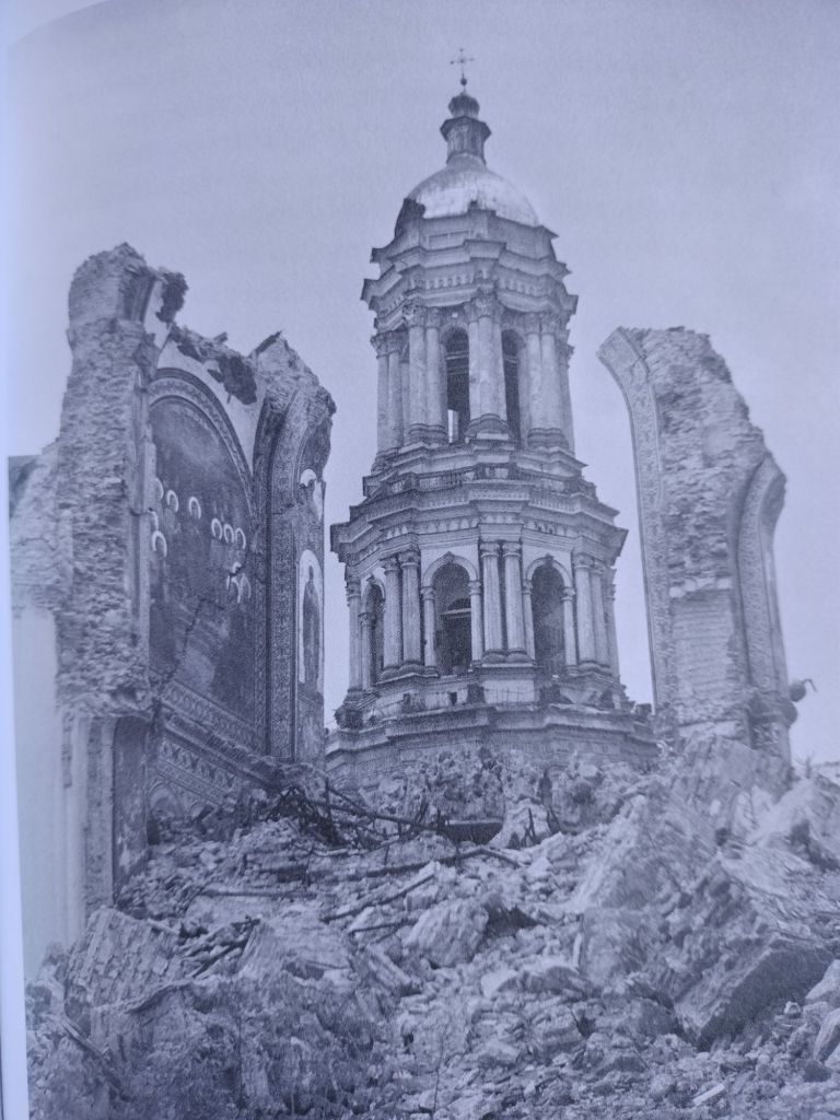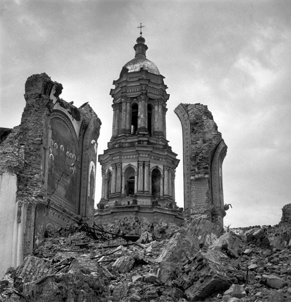Dalla piccola città di gesso, così nuova che ancora non era stata costruita, andammo all’antico monastero sulla collina. Un tempo era stato il centro della chiesa russa. Una delle primissime costruzioni religiose. Era stato maestoso, con edifici e dipinti che risalivano al XII secolo. Questo monastero, quando arrivarono i tedeschi, era il deposito di molti tesori di fama mondiale. Dopo aver portato via la maggior parte dei tesori, i tedeschi lasciarono la città e distrussero gli edifici con bombe incendiare per nascondere i loro furti. Ora il monastero non è altro che un gran mucchio di mattoni e di muri sgretolati da cui occhieggiano piccoli lembi di affreschi. Non sarà ricostruito perché non è possibile. Ci sono voluti secoli per edificarlo e ora non c’è più. Le erbacce che seguono la distruzione hanno invaso il cortile. In una cappella semi diroccata di fronte all’altare distrutto, vedemmo una misera figura di donna prostrata al suolo. Era al di là di un cancello aperto, attraverso il quale un tempo potevano passare solo lo zar e la sua famiglia, una donna dall’aspetto spiritato è scomposto andava avanti e indietro facendosi monotonamente il segno della croce e mormorando.