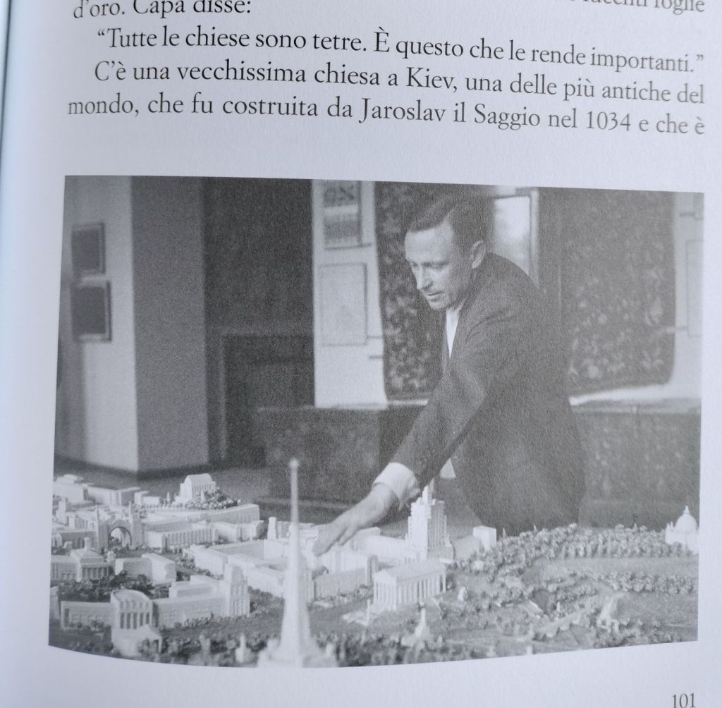 Attraversammo il centro della città devastato e distrutto, al di là dell’angolo dove furono impiccate le belve tedesche dopo la guerra. Nel museo c’erano i progetti della nuova città. Una volta di più ci fu chiaro quanto il popolo russo viva di speranza, la speranza che il domani sarà migliore dell’oggi. Nel museo c’era un modello della nuova città in gesso bianco, con le linee classiche, le immense costruzioni, le colonne, le cupole e gli archi e i giganteschi monumenti, tutto di marmo bianco. Questo modello in gesso della città futura occupava quasi tutta una stanza. Il direttore del museo ci indicò vari edifici: questo sarebbe stato il palazzo dei Soviet, quello è il museo, qui un altro museo.