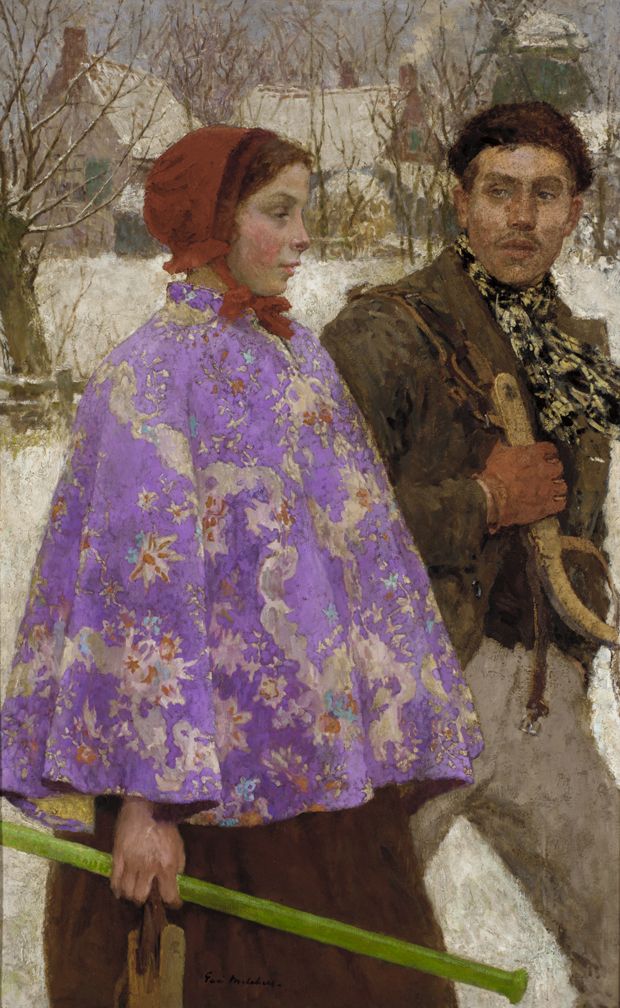 Chiunque avesse seguito la mania dell’Olanda si era assicurato un futuro di successo. Uno dei dipinti di Gari Melchers, una scena dolce, una melodia struggente, mi commuove come un ricordo. Mi viene un nodo alla gola ogni volta che guardo la riproduzione a tutta pagina inclusa in Dutch Utopia, il catalogo che accompagnava l’omonima mostra al museo Singer di Laren e in tre stati americani, Georgia, Ohio e Michigan, nel 2010. È un dipinto incantevole, quasi troppo bello per essere vero, eppure evoca in me un pomeriggio d’inverno che è reale quanto lo stridio delle lame dei pattini sul ghiaccio leggermente irregolare. Con Pattinatori, Melchers voleva confutare l’accusa di raffigurare nei suoi dipinti olandesi solo contadini rozzi e ignoranti. Per la coppia di innamorati che scivola elegantemente attraverso il paesaggio innevato scelse i suoi modelli abituali, Anna e Arie Zoon. Per rendere il tutto ancora più raffinato, adornò Anna con una mantellina viola e magenta: una cappa, un mantello. Anna e Arie non stanno ancora volteggiando, il loro amore è appena sbocciato e pattinano davanti a noi lentamente, con esitazione.