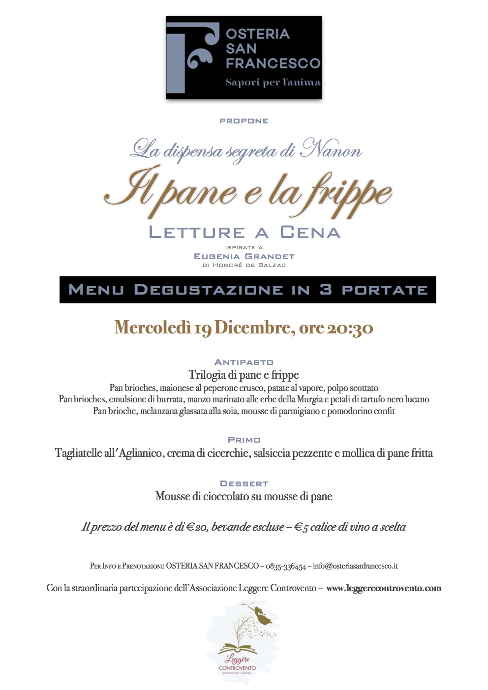 La sera del 19 dicembre ’18, all’Osteria San Francesco di Matera abbiamo letto ad alta voce una riduzione quasi teatrale di Eugenia Grandet di Honoré de Balzac, con la voce di nove lettori non professionisti.